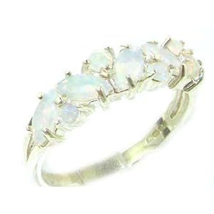 A Beautiful English Hallmarked Sterling Silver Solid Opal Ring. This stunning ring has been set with with five Marquise cut 6x3mm (0.24" x 0.12") and four 2.5mm (0.1") High Quality Very Colorful Australian Opals in this Highly Unusual Eternity Setting. The Fabulous play of Sparkling Colors within these Opals make this a very pretty ring indeed.All the Opals are 100% Genuine Natural Australian Opal, they are not doublets or triplets.Due to the arrangement of the gemstones and its slim design, this ring can easily be worn alongside an existing wedding ring if required. It is quite an unusual style for an Eternity ring which makes it a very individual piece of jewellery, it is an exceptionally pretty ring.The Quality of this piece is Superb, each Gemstone has been securely claw set by a Master Jeweller, follow the ring round and you have good thick shank which shows that this is a quality design.The ring has been Fully Hallmarked in London, by the London Assay Office - Solid Sterling Silver, the markings include 925 (the symbol for Sterling Silver), the Leopards Head (the symbol for the London Assay Office) and Royal Lion (which confirms their Royal Appointment)..